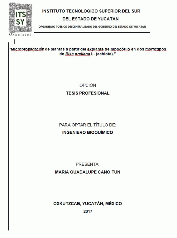 Micropropagación de plantas a partir del explante de hipocótilo en dos morfotipos de Bixa orellana L.(achiote) [recurso electrónico] / María Guadalupe Cano Tun