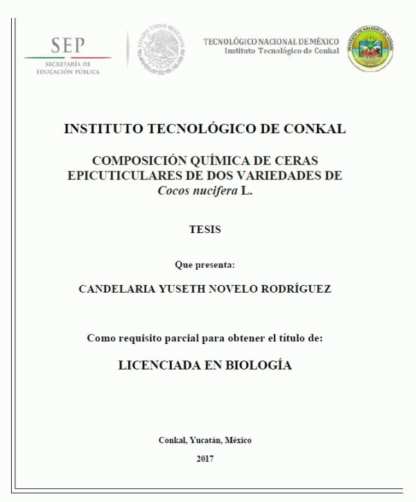 Composición química de ceras epicuticulares de dos variedades de Cocos nucifera L. [recurso electrónico] / Candelaria Yuseth Novelo Rodríguez