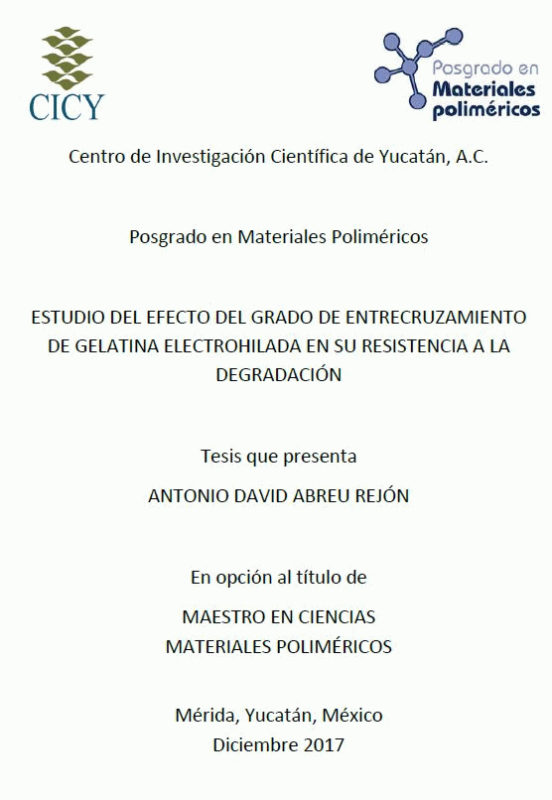 Estudio del efecto del grado de entrecruzamiento de gelatina electrohilada en su resistencia a la degradación [recurso electrónico] / Antonio David Abreu Rejón