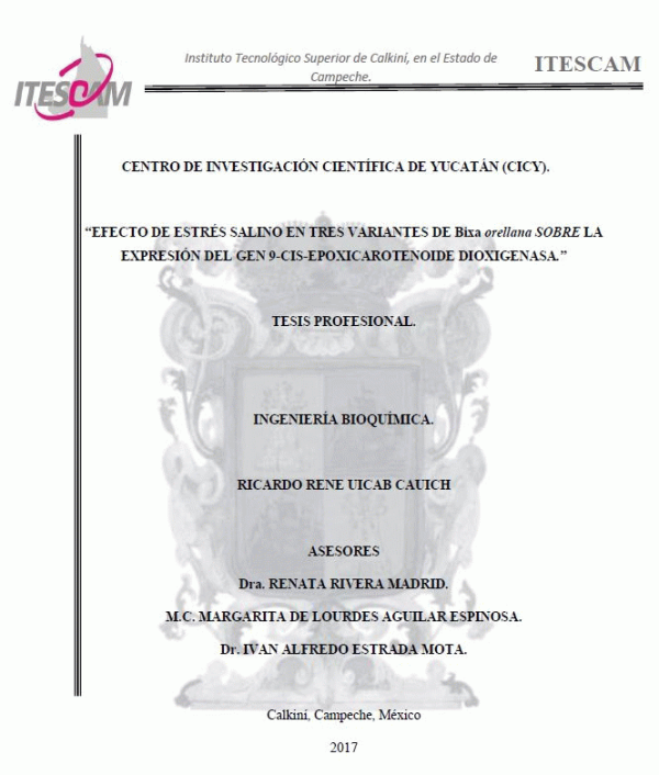 Efecto de estrés salino en tres variantes de Bixa orellana sobre la expresión del Gen 9CIS-Epoxicarotenoide Dioxigenasa [recurso electrónico] / Ricardo Rene Uicab Cauich