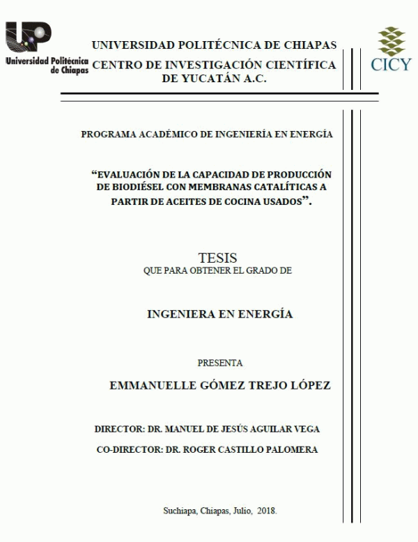 Evaluación de la capacidad de producción de biodiesel con membranas catalíticas a partir de aceites de cocina usados [recurso electrónico] / Emmanuelle Gómez Trejo López