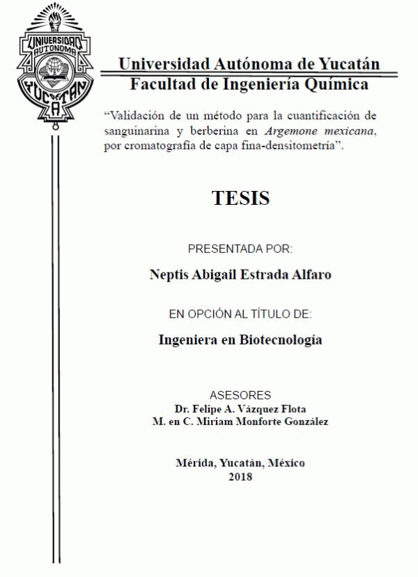 Validación de un método para la cuantificación de sanguinarina y berberina en Argemone mexicana, por cromatografía de capa fina-densitometría [recurso electrónico] / Neptis Abigail Estrada Alfaro