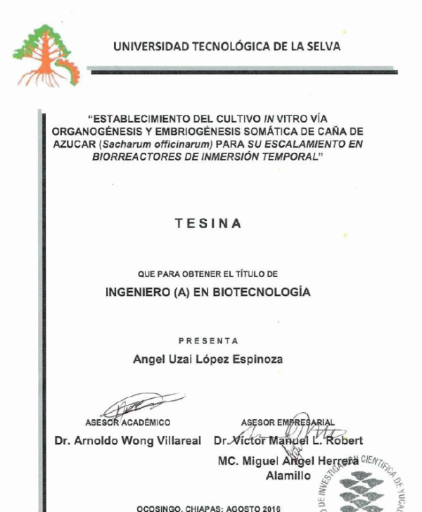 Establecimiento del cultivo in vitro vía organogénesis y embriogénesis somática de caña de azúcar (Sacoharum officinarum) para su escalamiento en biorreactores de inmersión temporal [recurso electrónico] / Angel Uzai López Espinoza