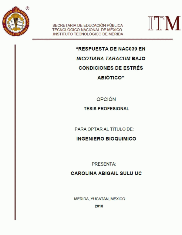 Respuesta de NAC039 en Nicotiana tabacum bajo condiciones de estrés abiótico [recurso electrónico] / Carolina Abigail Sulu Uc