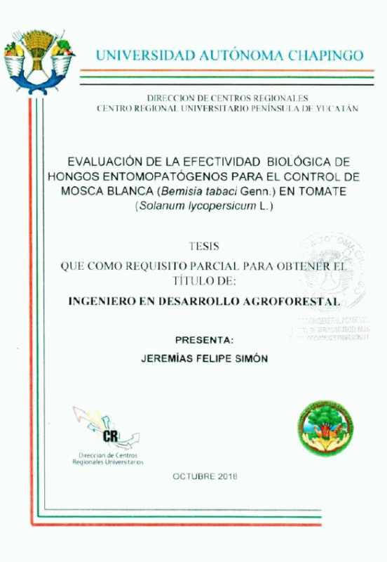 Evaluación de la efectividad biológica de hongos entomopatógenos para el control de mosca blanca (Bemsia tabaco GENN) en tomate (Solanum lycopersicum L.) [recurso electrónico] / Jeremías Felipe Simón