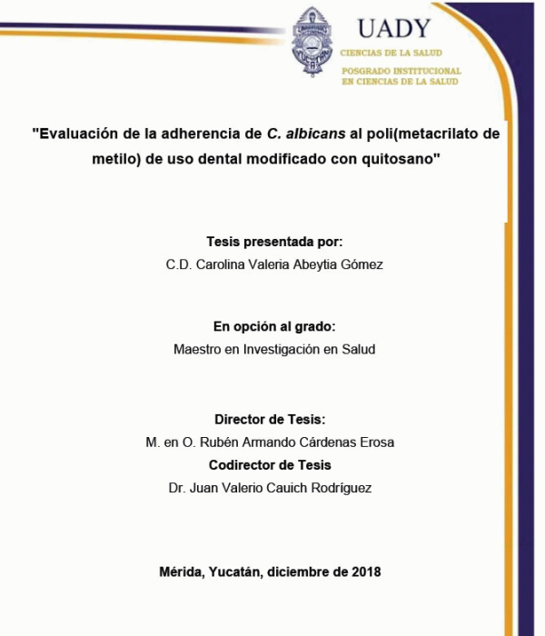Evaluación de la adherencia de C. albicans al poli(metacrilato de metilo) de uso dental modificado con quitosano [recurso electrónico] / Carolina Valeria Abeytia Gómez