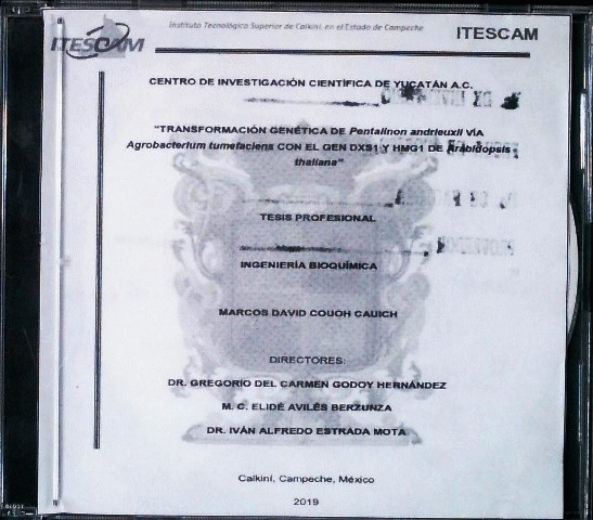 Transformación genética de Pentalinon andrieuxii vía Agrobacterium tumefaciens con el gen DXS1 y HMG1 de Arabidopsis thaliana [recurso electrónico] / Marcos David Couoh Cauich