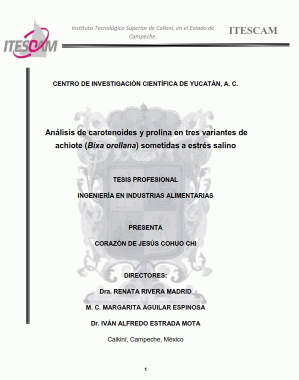 Análisis de carotenoides y prolina en tres variantes de achiote (Bixa Orellana) sometidas a estrés salino [recurso electrónico] / Corazón de Jesús Cohuo Chí