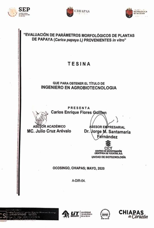 Evaluación de parámetros morfológicos de plantas de papaya (Carica papaya L.) provenientes in vitro [recurso electrónico] / Carlos Enrique Flores Guillén