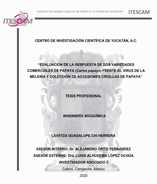 Evaluación de la respuesta de dos variedades comerciales de papaya (Carica papaya) frente al virus de la meleira y colección de accesiones criollas de papaya [recurso electrónico] / Liuvitza Guadalupe Chi Herrera