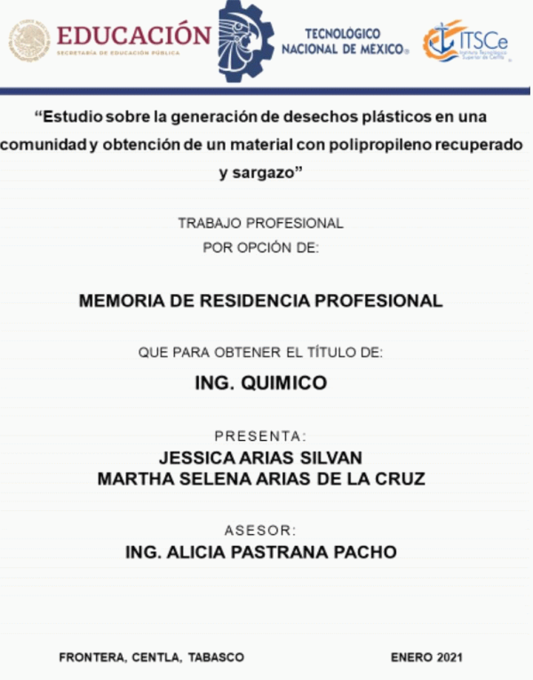 Estudio de la generación de desechos plásticos en una comunidad y obtención de un material con polipropileno recuperado y sargazo [recurso electrónico] / Jessica Arias Silvan, Martha Selena Arias de la Cruz