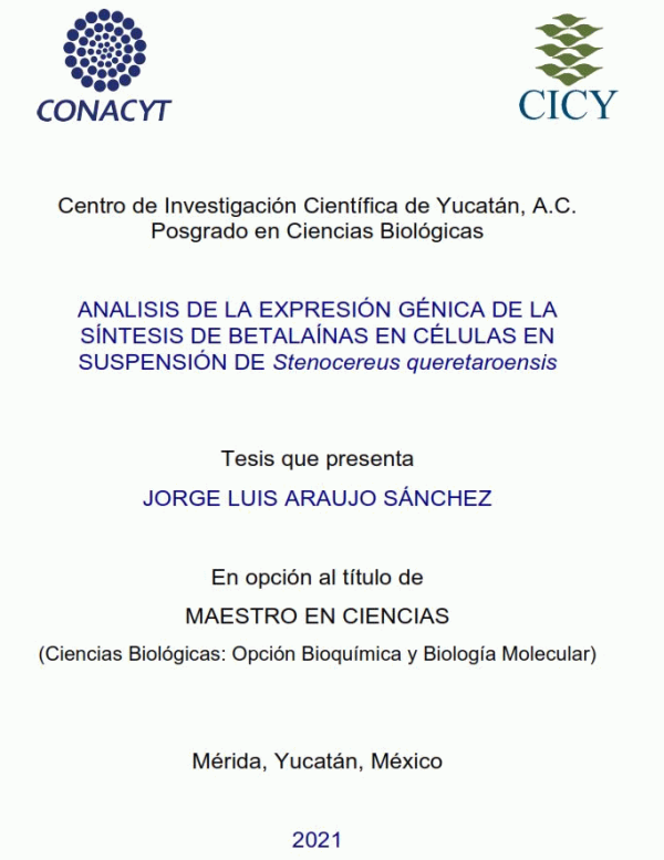 Análisis de la expresión génica de la síntesis de betalaínas en células en suspensión de Stenocereus queretaroensis [recurso electrónico] / Jorge Luis Araujo Sánchez
