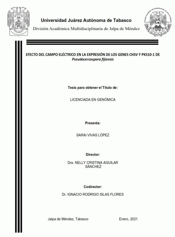 Efecto del campo eléctrico en la expresión de los genes CHSV Y PKS10-1 de Pseudocercospora fijiensis [recurso electrónico] / Sarai Vivas López