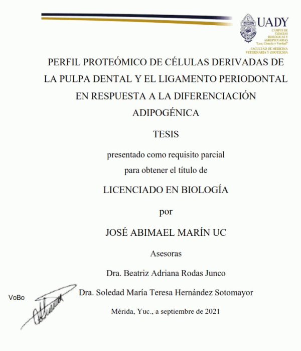Perfil proteómico de células derivadas de la pulpa dental y el ligamento periodontal en respuesta a la diferenciación adipogénica [recurso electrónico] / José Abimael Marín Uc