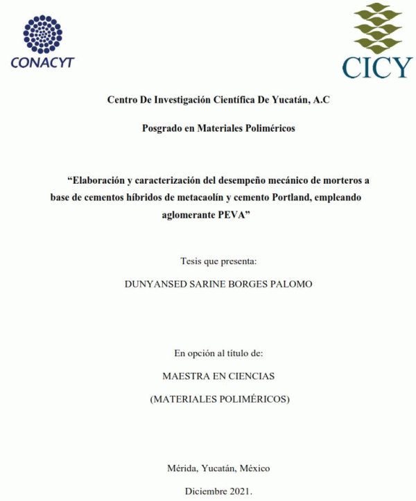 Elaboración y caracterización del desempeño mecánico de morteros a base de cementos híbridos de metacaolín y cemento Portland, empleando aglomerante PEVA [recurso electrónico] / Dunyansed Sarine Borges Palomo