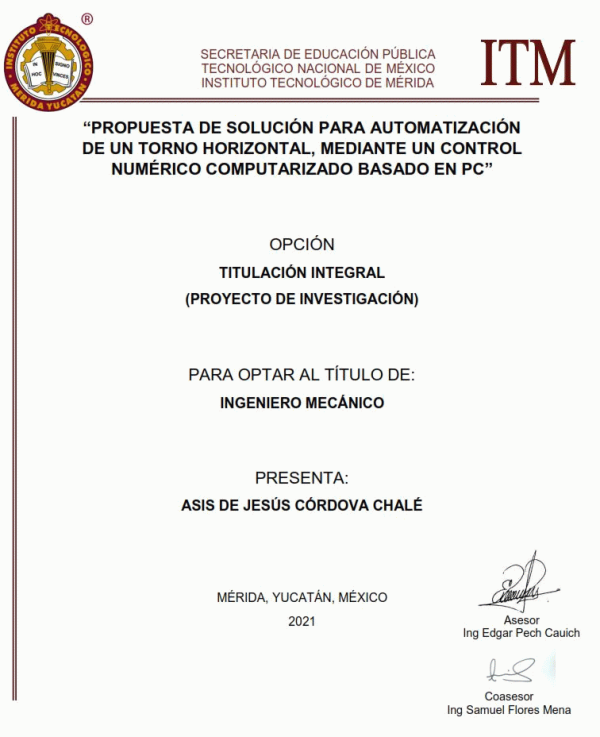 Propuesta de solución para automatización de un torno horizontal, mediante un control numérico computarizado basado en PC [recurso electrónico] / Asis de Jesús Córdova Chalé