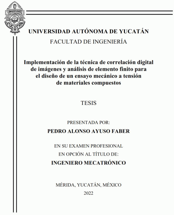 Implementación de la técnica de correlación digital de imágenes y análisis de elemento finito para el diseño de un ensayo mecánico a tensión de materiales compuestos [recurso electrónico] / Pedro Alonso Ayuso Faber