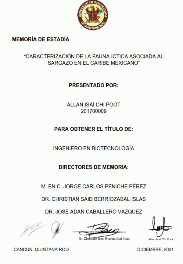 Caracterización de la fauna íctica asociada al sargazo en el caribe mexicano [recurso electrónico] / Allan Isaí Chi Poot